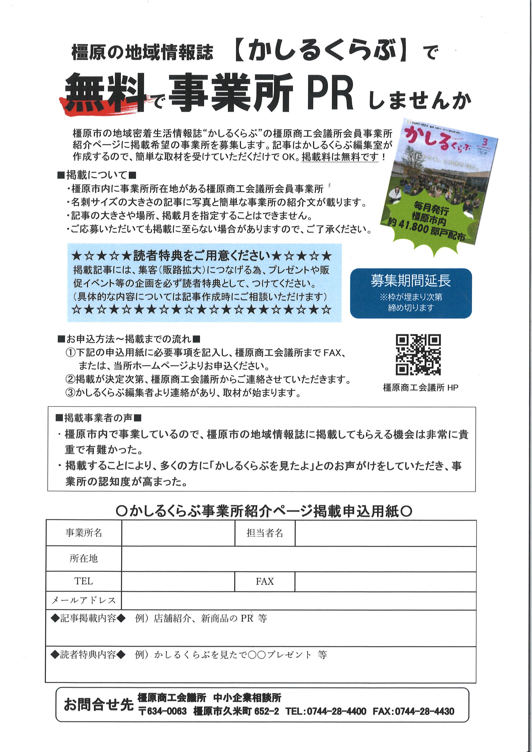 橿原市の地域密着生活情報誌“かしるくらぶ”の橿原商工会議所会員事業所紹介ページに掲載希望の事業所を募集します。