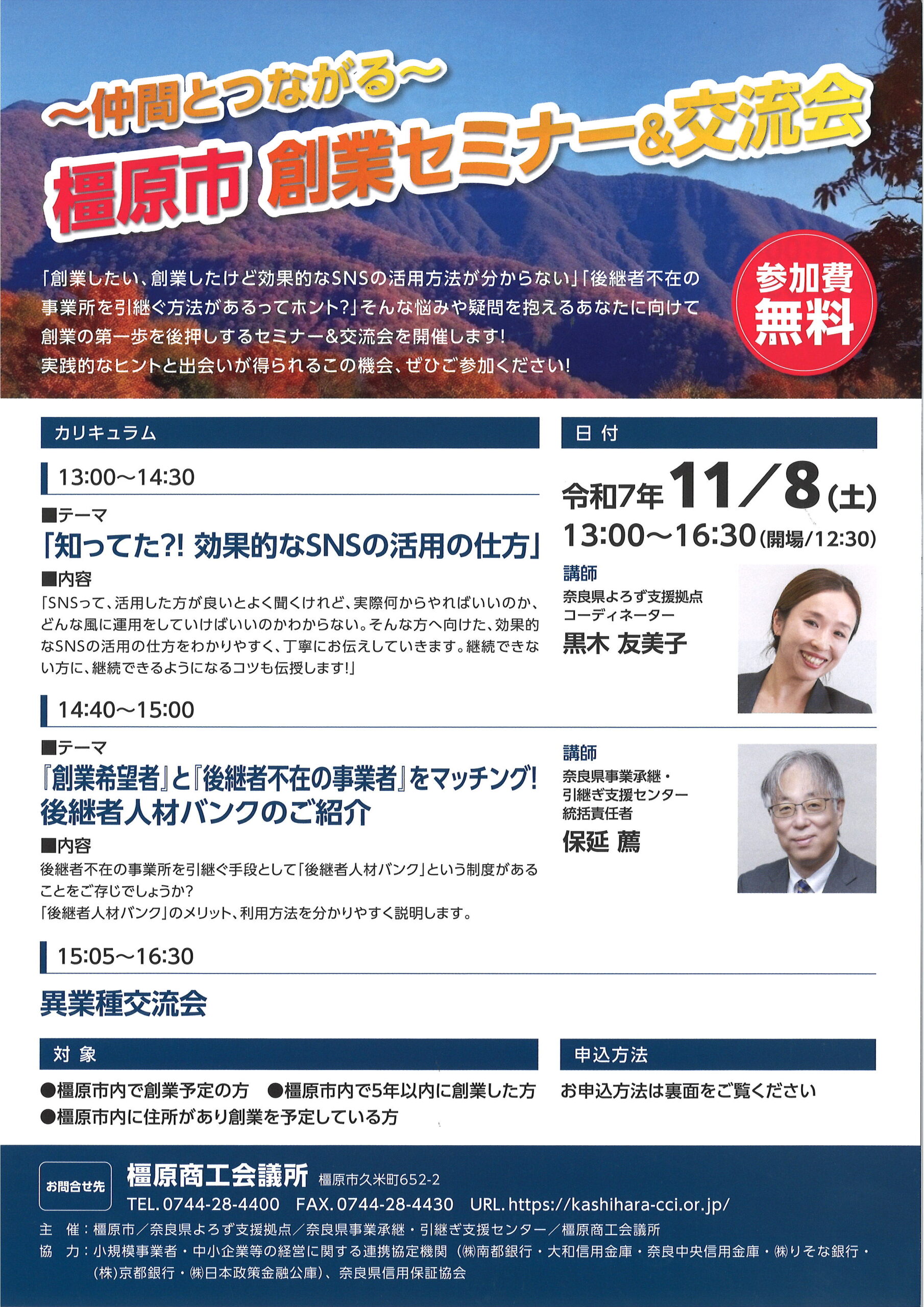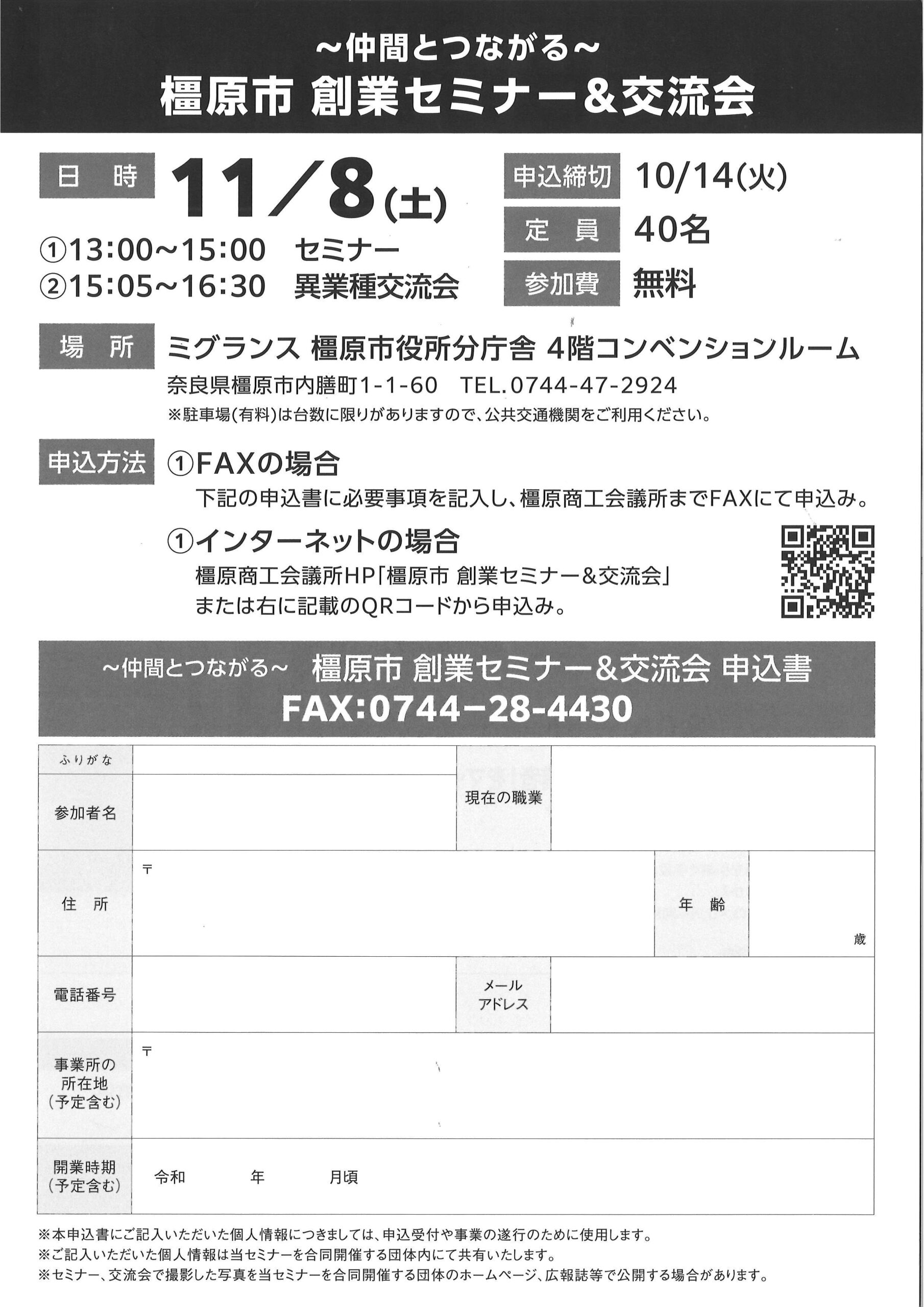 申込書(チラシ裏面)に必要事項を記入し、橿原商工会議所までFAXにて申込み。