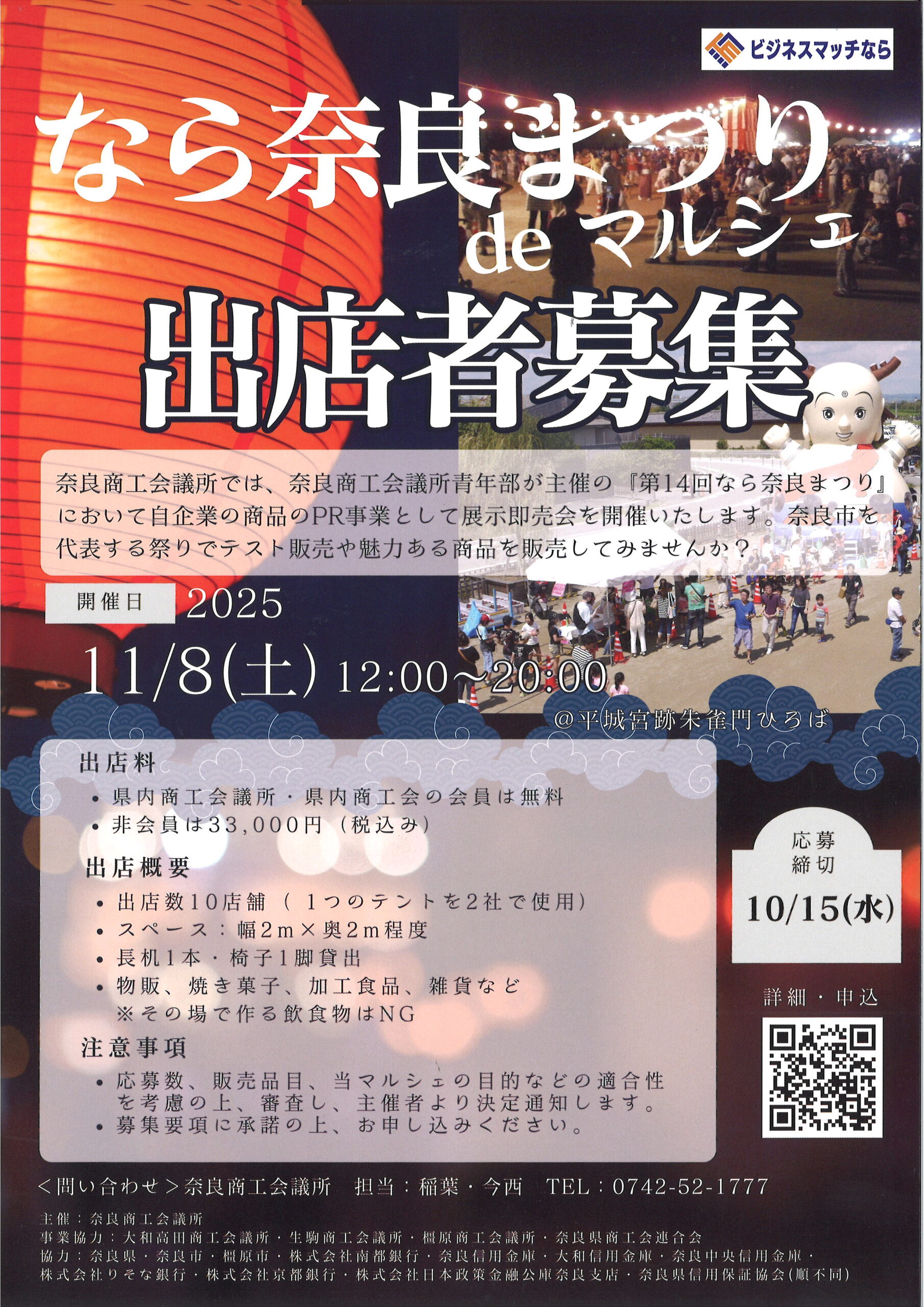 2025.10.01 【11/8】なら奈良まつりdeマルシェ 出店者募集 開催日 11/8(土)12:00~20:00 出店料 県内商工会議所・県内商工会の会員は無料 非会員は33,000円(税込) 応募締切 10/15(水) お問い合わせ 奈良商工会議所 担当:稲葉・今西 TEL:0742-52-1777