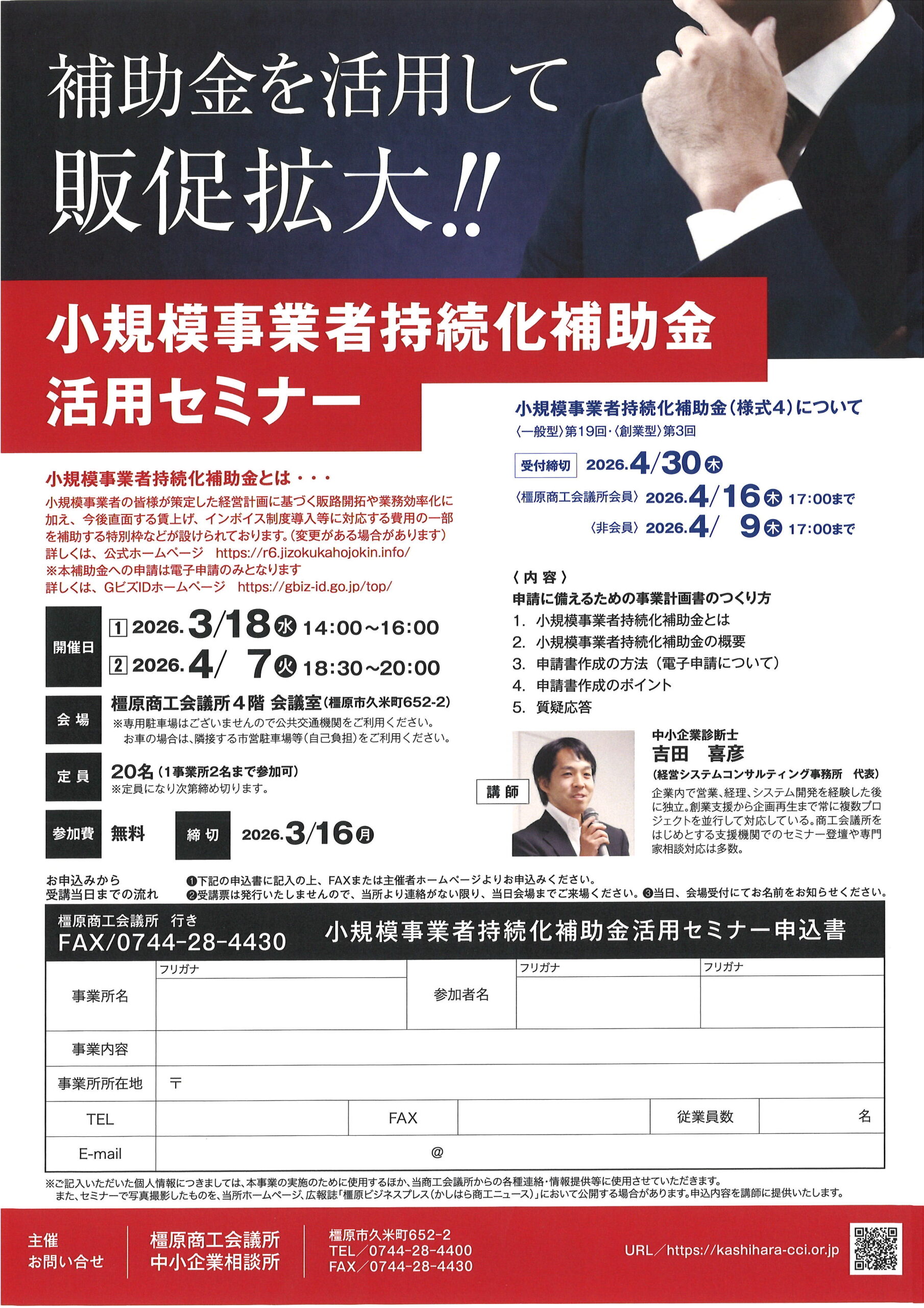2026.03.02 【3/2~】小規模事業者持続化補助金専門家アドバイス相談 期間 令和8年3月2日(月)~令和8年4月10日(金) 対象 中小・小規模事業者 相談料 無料 申込方法 チラシの申込書にてお申込みください。 当所より相談日の調整のご連絡をいたします。 お問合せ 橿原商工会議所 中小企業相談所 〒634-0063 橿原市久米町652番地2 TEL 0744-28-4400 FAX:0744-28-4430
