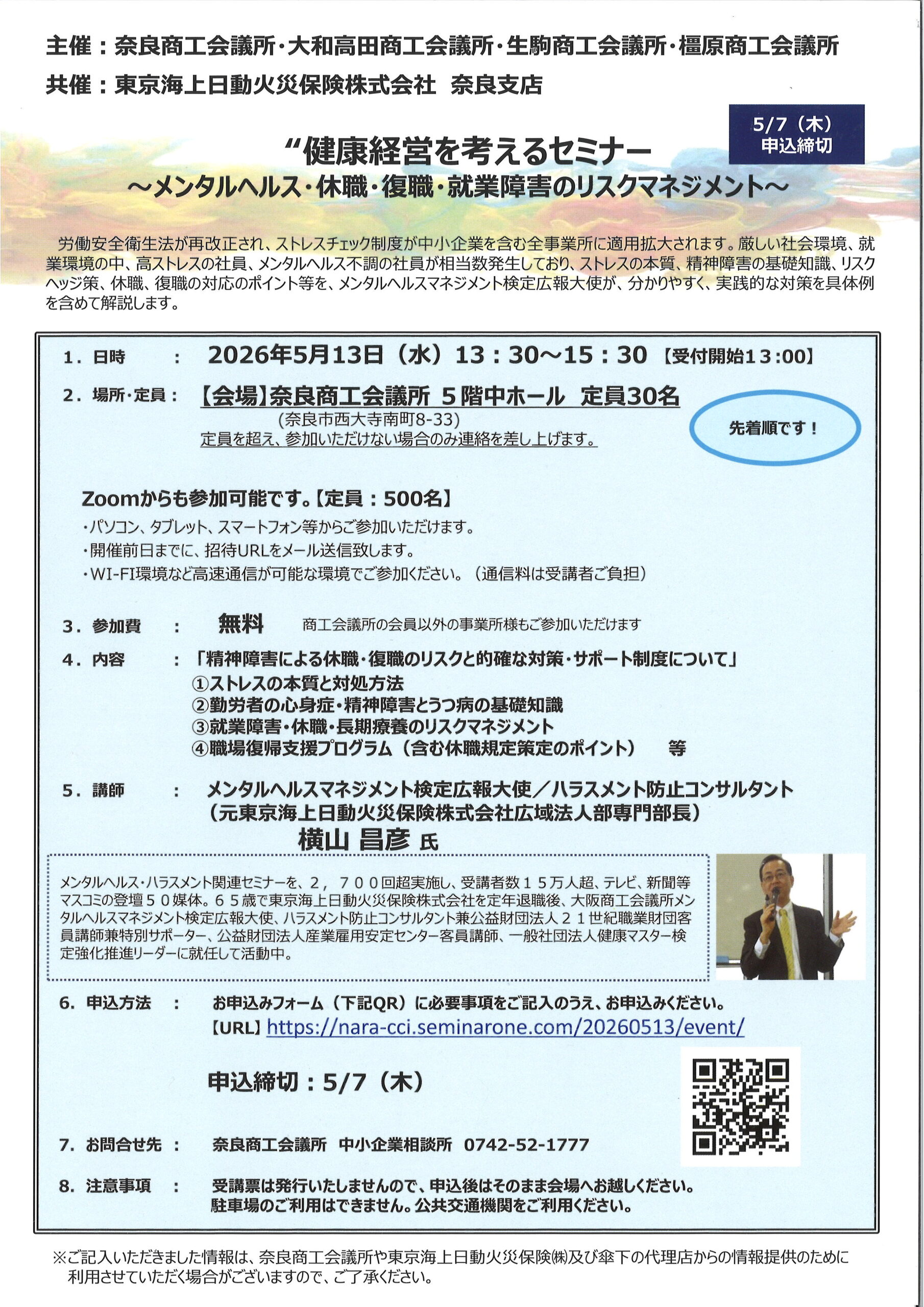 【会場】奈良商工会議所 5階中ホール 定員30名(奈良市西大寺南町8-33)